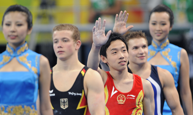 China's Zou Kai (C), United States' Jonathan Horton (R) and Germany's Fabian Hambuechen (L) proceed to the podium after the men's horizontal bars final of the artistic gymnastics event of the Beijing 2008 Olympic Games in Beijing on August 19, 2008. China's Zou Kai won the gold, United States' Jonathan Horton the silver and Germany's Fabian Hambuechen the bronze.(FRANCK FIFE/AFP/Getty Images)