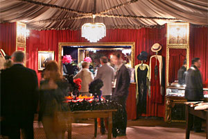 What I did not realize when I entered the front doors of those tents, was that I was entering an exotic world of wonderful, zany entertainment and dining. We were immediately greeted by a hostess dressed in period cabaret clothing. In fact there was a lot of staff around, both male and female, attired the same way, greeting every arriving guest. We all gathered in the main lobby area where there was a central bar set up. Also, there was a boutique where guests could buy feather boas, junk jewelry, period hats, fake mustaches, etc., to buy and wear to get into the spirit of the evening. There were also all kinds of props inside that gave it a carnival/ circus atmosphere.