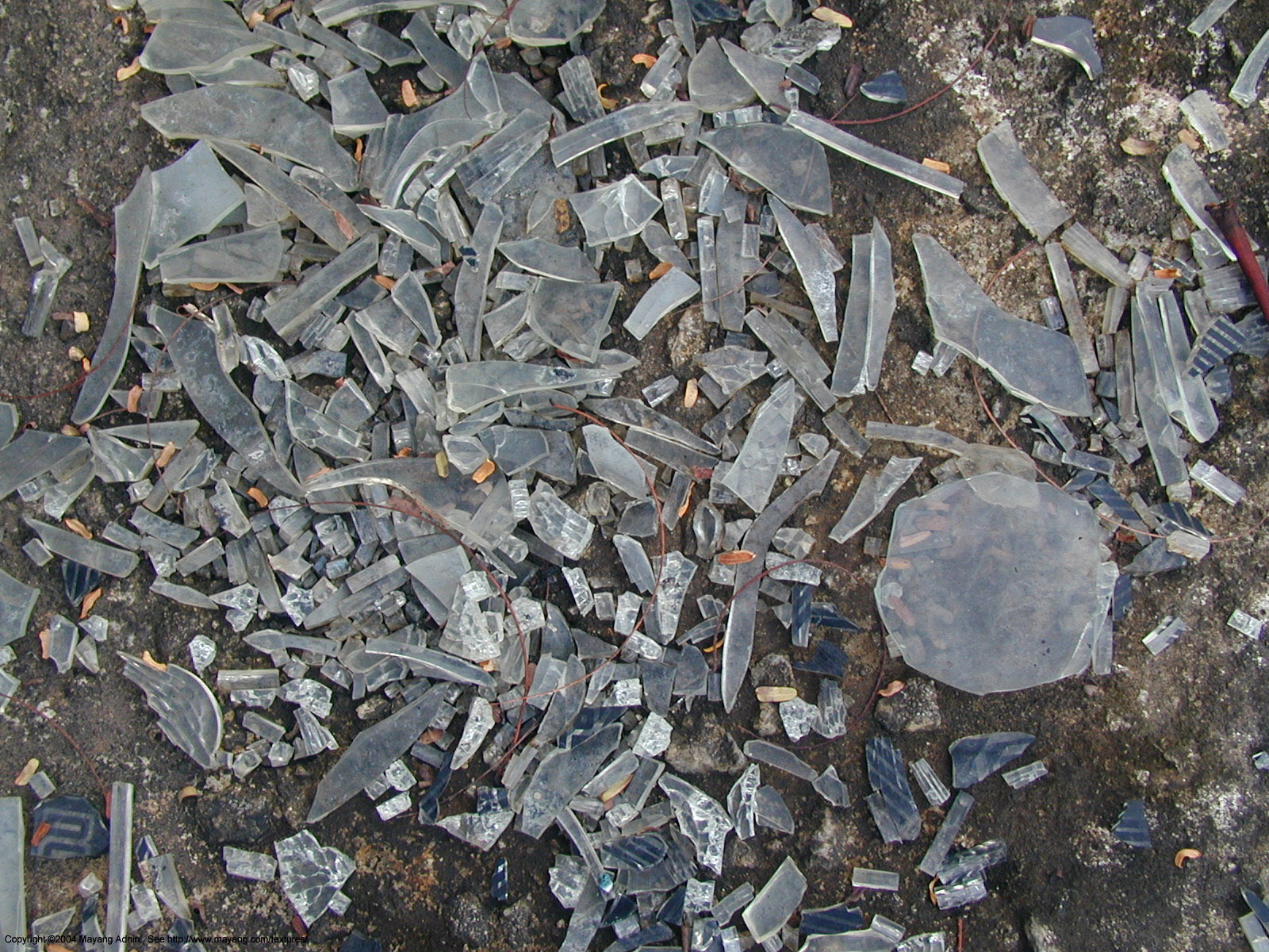 There is shattered glass all around us. There is also a broom and a dustpan. We just need to get to work to start cleaning things up.