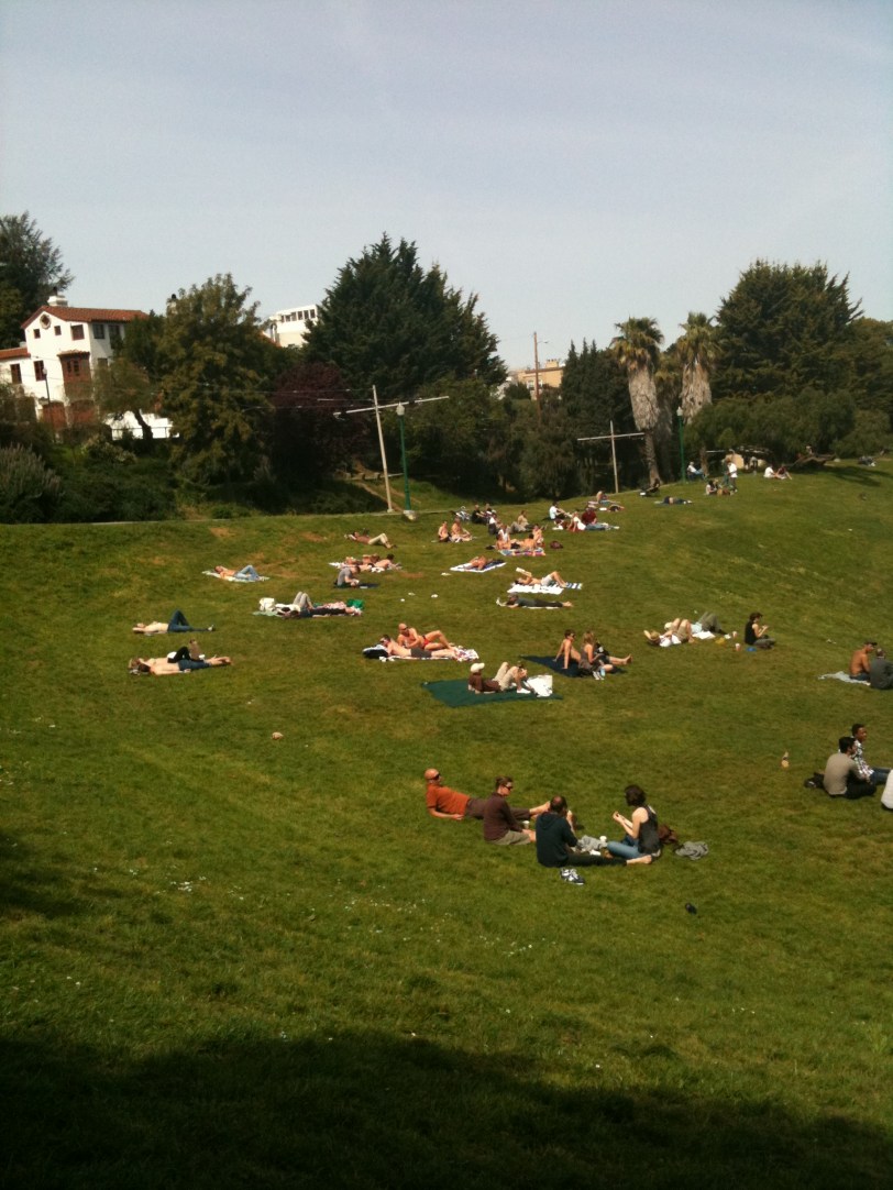 There is something about enjoying a sunny leisurely time at the well known Dolores Park in San Francisco under a sunny, brilliant blue sky that releases all the burdens of life. I especially like this past Sunday there with a few friends sitting enjoying the scenery with the glory of the San Francisco landscape before us and the sunning beautiful people below us.