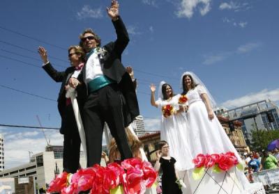 The "All Families Are Forever" float made a point about gay marriage. The Pride Parade wound it's way through the streets of Salt Lake City on Sunday. (Scott Sommerdorf / Salt Lake Tribune)