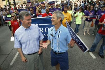 Salt Lake County Mayor Peter Corroon, left, and Salt Lake City Mayor Ralph Becker talk at the beginning of the parade route on Sunday. (Scott Sommerdorf / Salt Lake Tribune)