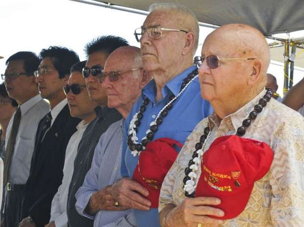 Liberators, from right, Thomas Spry, Gerald Hanson, and Dan Bradley Sr. place their hands on their hearts during the singning of the national anthem at a World War II commemoration ceremony on July 20. The ceremony was held at the War in the Pacific National Historical Park Asan Bay Overlook. All three veterans took part in the liberation of the island from Japanese occupation.